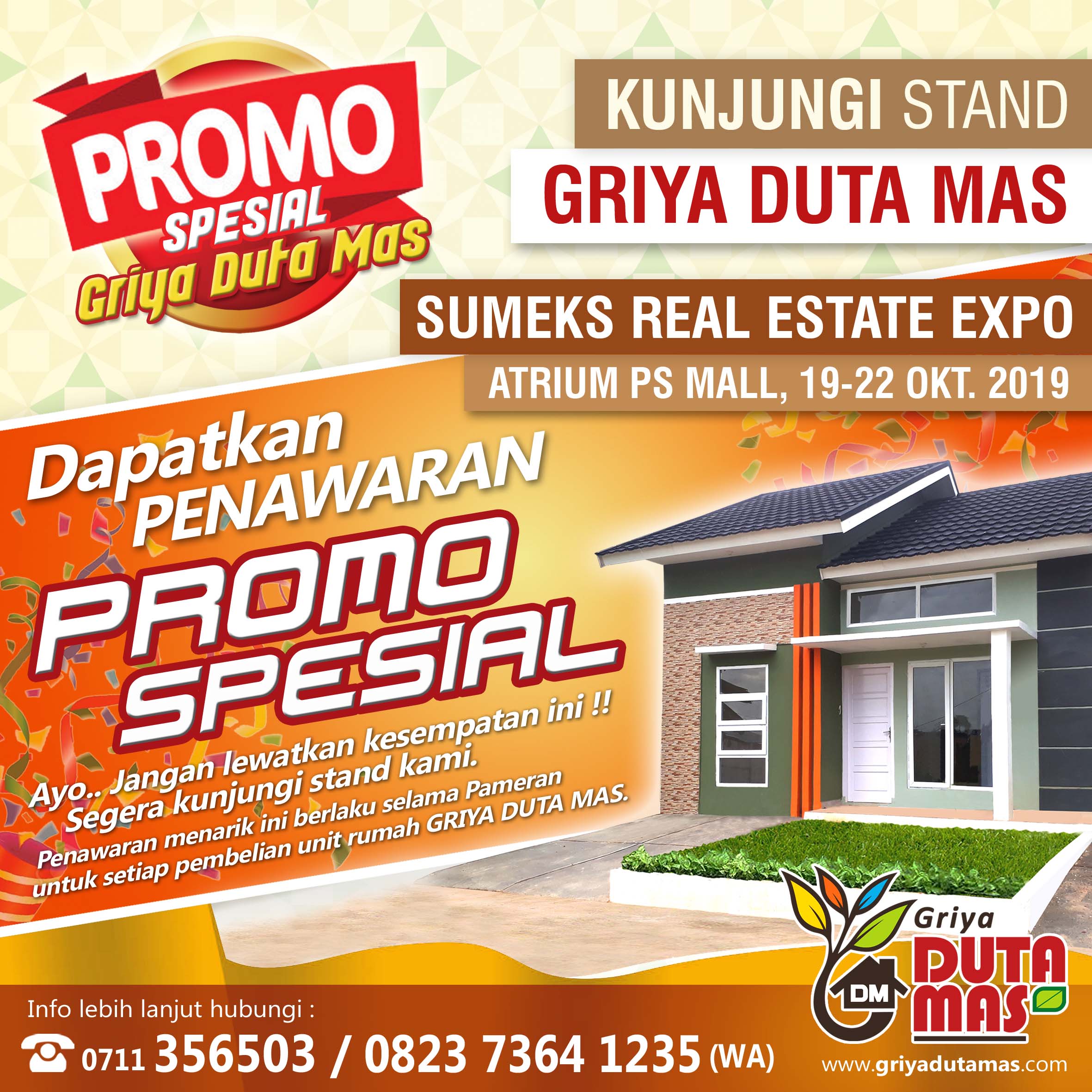 Ayo kunjungi stand kami di Palembang Indah Mall dalam acara PALEMBANG PROPERTY EXPO 2019. Dapatkan penawaran terbatas PROMO SPESIAL untuk setiap pembelian unit di Griya Duta Mas. Segera hubungi marketing kami untuk info lebih lanjut....Selengkapnya