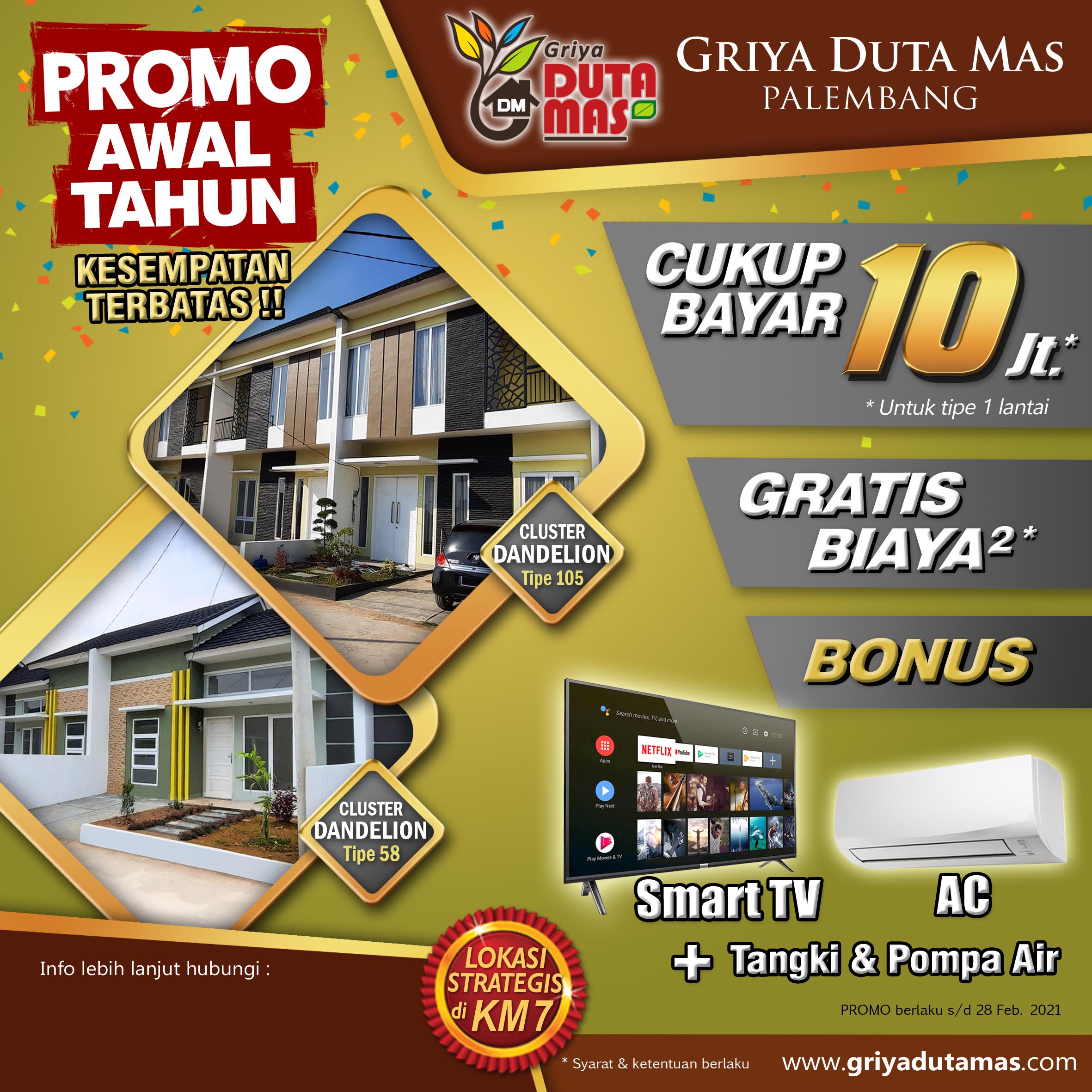 Manfaatkan penawaran PROMO AWAL TAHUN dari GRIYA DUTA MAS, dapatkan bonus Smart TV, AC, ditambah tangki dan pompa air untuk setiap pembelian unit di cluster Dandelion. Penawaran terbatas hingga 28 Februari 2021. Cukup dengan 10 Jt (untuk tipe 1 lantai) dan gratis biaya-biaya. Jadi jangan tunda lagi ...Selengkapnya