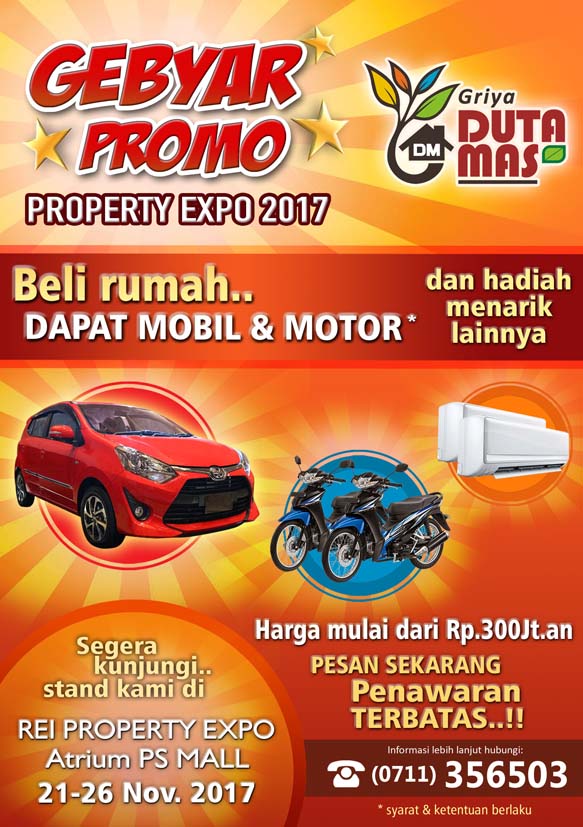 Kunjungi stand kami di REI Property Expo 2017 pada tanggal 21 s/d 26 November 2017 di atrium PS Mall Palembang. Komplek Perumahan Griya Duta Mas harga mulai dari Rp.300 Jt.an dapatkan KEJUTAN SPESIAL penawaran terbatas hadiah mobil, motor, ac, free biaya-biaya, potongan harga dan promo menarik lainn...Selengkapnya